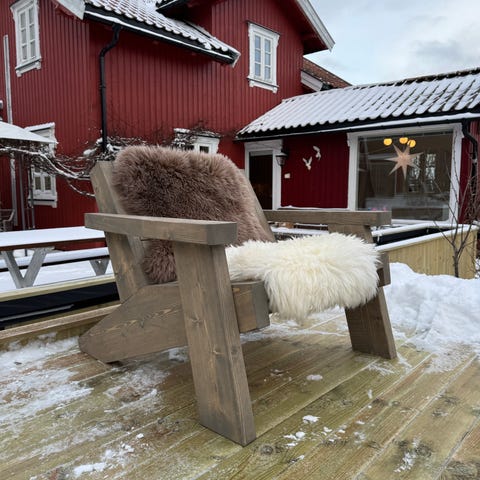 Håndlaget utemøbler fra Vestlandske heiltremøblar i solid treverk av tuja. Settet inkluderer et bord, benk og to krakker og er ideelt for utendørs bruk. Overflatene er lakkert med klar lakk og understellet er malt sort.