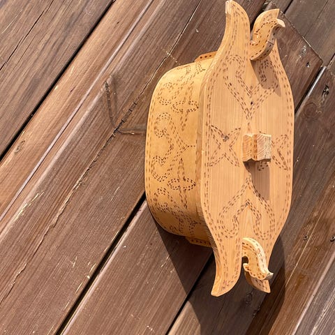 Håndlaget buklija, også kjent som en tradisjonell trekolbe eller flaske.