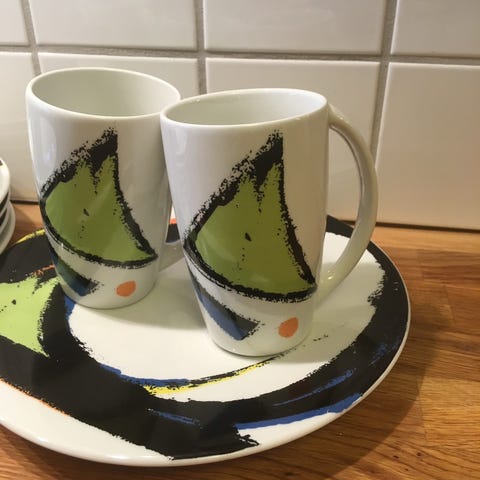 Figgjo servise med bilder av fisk, hvit og grønn i fargen. Settet inkluderer 9 tallerkner, 1 stort fat, 2 boller (en med lokk) og to små tallerkner med dekorative fiskemotiv. Sendes ikke.