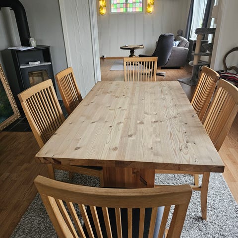 Selger vårt brukte eike spisebord da vi må over til ett litt mindre bord. Et solid og bra spisebord som vi har vert veldig fornøyde med. Har noen bruksmerker (se bilde i annonsen). Bare og skrive hvis du lurer på noe!😊