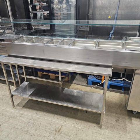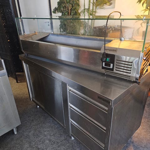 Vitrine kjøleskap med glasspaneler og sort ramme. Utstyrt med flere hyller for optimal oppbevaring av matvarer. Passer for bruk i butikker, kafeer eller restauranter for å holde mat kjølig og presentabel.
