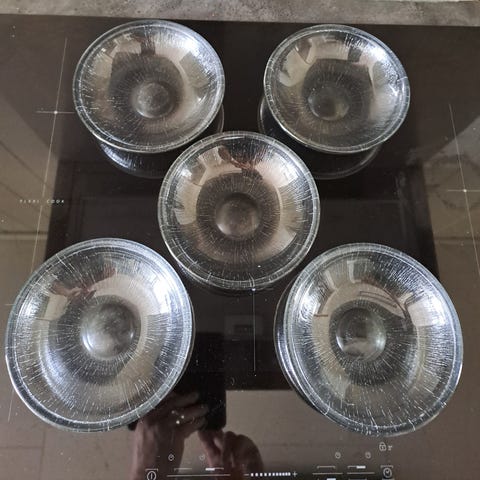 Hadeland «Fersken» av Willy Johansson, 4 tallerken i sotet glass. 17 cm. Med rillet mønster på undersiden.