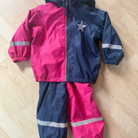 Selger et pent brukt regnsett fra Navigare, str 7 år. Jeg finner ingen hull, og ingen merker av betydning, men bruksmerker kan forekomme. Det er brukt, men hatt flere sett så mye bruk igjen. Settet er merket med navn, og ene strikken under foten begynner å bli slitt, men fungerer fint enda. Jeg sender dersom du betaler frakt.