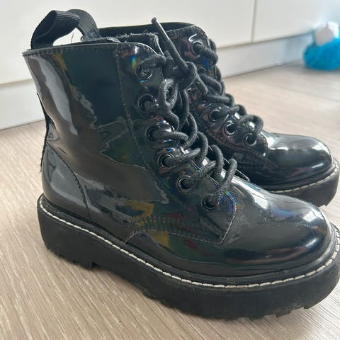 Selger kule boots fra H&M, svartlakkerte og med snøring. Pent brukt av en jente i to høstsesonger. Normal slitasje på skoene.