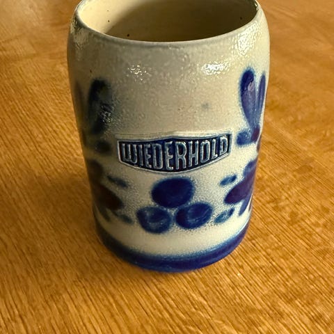 Ølkrus fra Tyskland. GR, Georgius Rex. Noen små spekker i hanken og helt oppe i kruse og noen hakk. 14 cm høye. Frakt I tillegg.