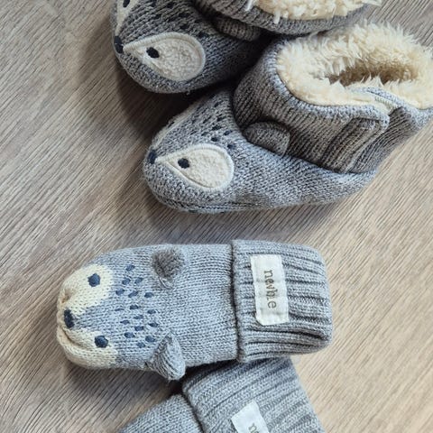 Selger dette søte settet til en liten gutt eller jente. Skoene er str 17-18 og vottene står som one size. Selges samlet for 130 kr.