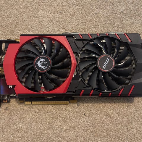 MSI Gaming skjermkort i en kombinasjon av rød og svart. Designet for å forbedre grafikkytelsen i datamaskiner. Egnet for gaming og grafikkintensive oppgaver.hdmi, mm.