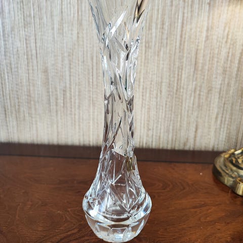 Vasen har diameter på toppen 3 cm, høyde 19 cm, vekt 750 g.