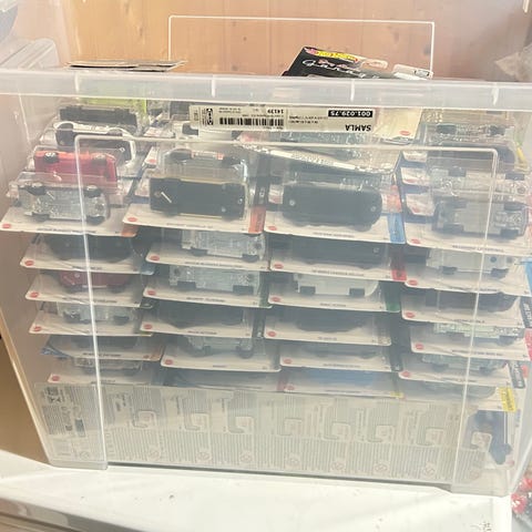Har og ett stort reservedels lager, der det meste er sortert og står i racks/kassetter med skuffer og er merket med delenr og bilder av delene.