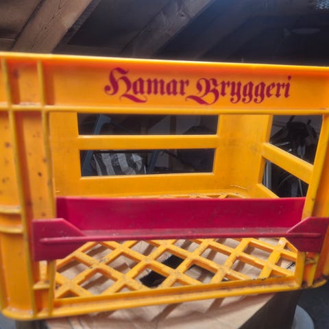4 trekasser rød carlsberg, nora bryggeri, Hønefoss bryggeri og en fruktkasse