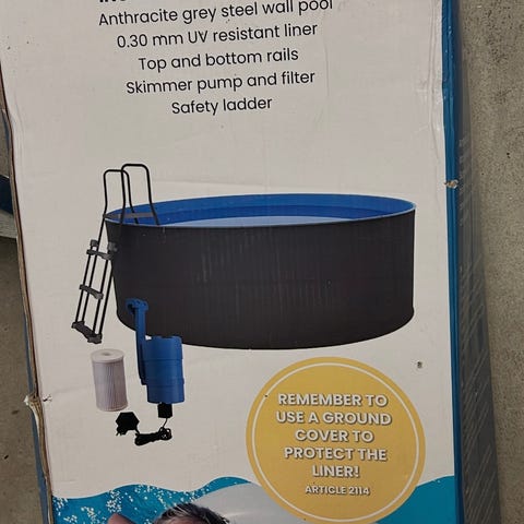 Sort stål rundt, gjør at bassengen samler varme fra solen, og holder bedre på varmen. Helt ny bobleduk til å legge på toppen. Stigen har vært brukt en uke i ett annet basseng, og er derfor montert.