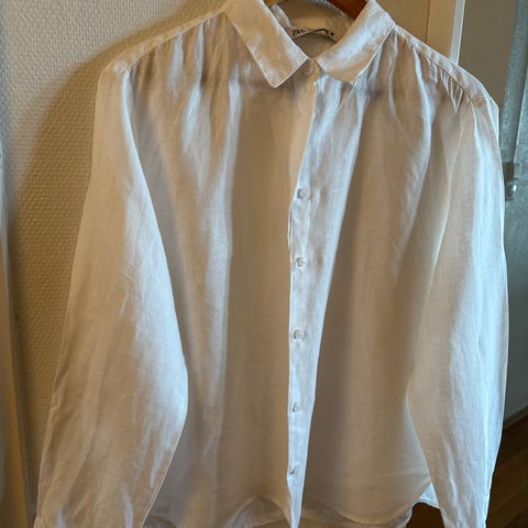 Skjorta er i merket Stradivarius. Finner ingen lapp med stofftype, men det kjennes ut som bomull. Kr. 35 pluss porto.