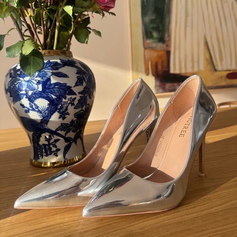 NA-KD Hæler i størrelse 41, laget i en sølvfarget finish. Disse skoene har en klassisk design med en spiss tå og blokkhæl. Brukt kun 1 gang.