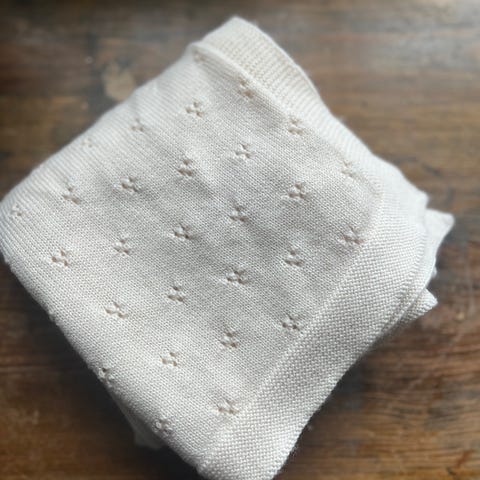 Deilig og mykt babyteppe strikket i Lanett Baby Ull fra Sandnes Garn. Hellt nytt. Strikket i hjem uten dyr og røyk.