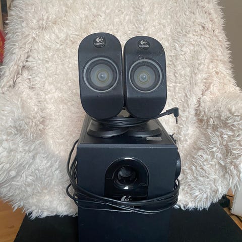 Logitech høyttalersystem i svart farge består av flere høyttalere og en subwoofer. Systemet er designet for å gi klar lyd og er ideelt for bruk med datamaskiner eller hjemmekinoanlegg. Høyttalerne er kompakte og kan enkelt plasseres rundt i rommet for optimal lydopplevelse. Men eneste problemet er at de er litt sprengt ikke alle men noen av de, har ikke funnet ut hvem av dem som er sprengt, man hører at de er sprengt når du hører på musikk kommer litt ann på hvordan musikk, men vis du skal bruke de til å se på vanlig tv å ha grei lyd så er de supre, og det er grei bass. Selges derfor billig.