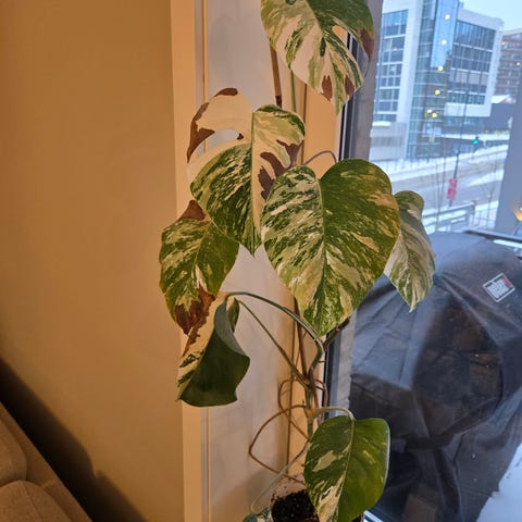Selger min vakre Monstera Variegata med mosestøtte og potte.