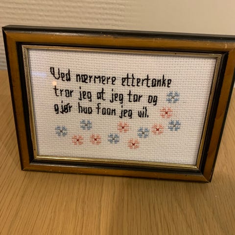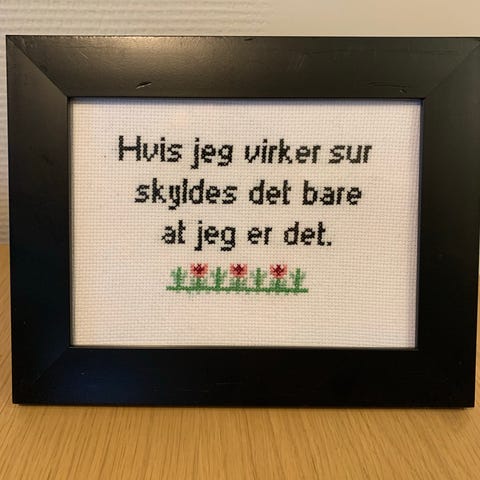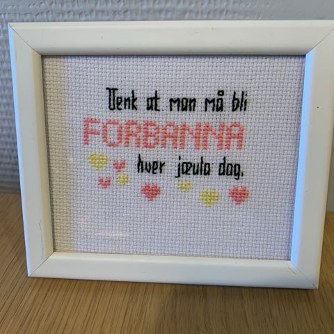 Kan brodere tilsvarende geriljabroderier på bestilling (korssting, tekst og noe pynt). Ta kontakt hvis det er tekster du ønsker brodert og satt i ramme.