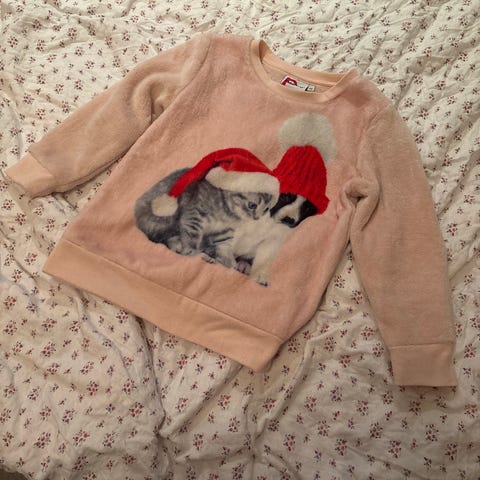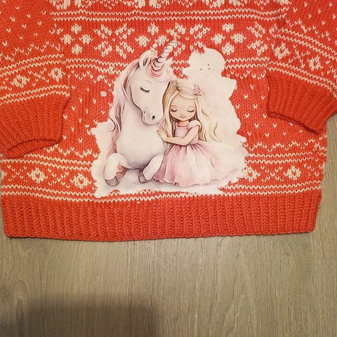 Strikket akrylgenser med koselig plysj snømann i front. Ferskenrosa. Ikke så myk som den en gang var, men ikke utvasket og har mye bruk igjen.
