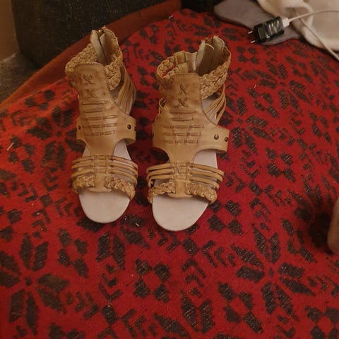 Gode sandaler i strl.37 fra Rialto med mye bruk igjen. Glidelåsåpning foran, stilig metalldetaljer på sidene. Lav hæl, gode og gå i.
