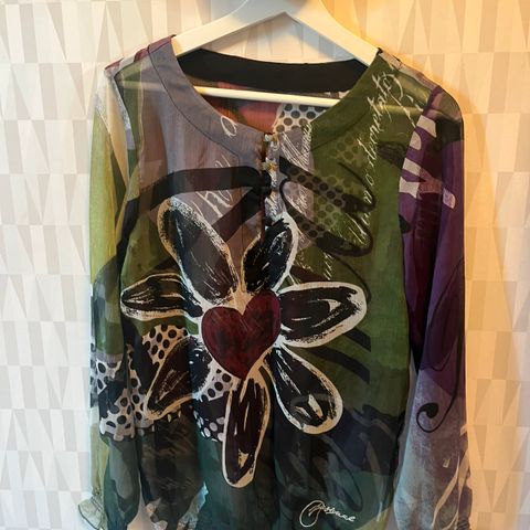 Desigual bluse i bomull med lange ermer. Trykk foran og bak og på ermene. Innfelt knytebånd nederst så blusen kan knytes.