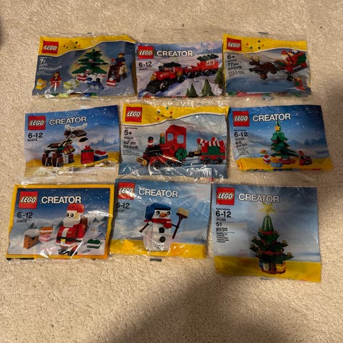 Lego sett med juletema. De fleste esker er i god stand, med 2 unntak som nevnt. Alle foruten 1 er uåpnet.