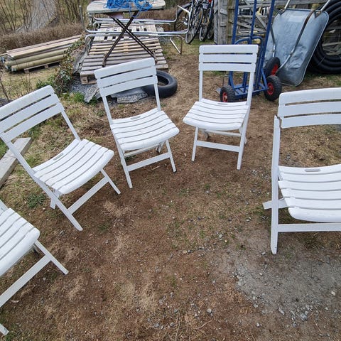 Fett holdt gamle stoler i eik heltre til salgs her sånn. Så gamle er de, at klinke-tekniske løsninger er tatt i bruk på metall (stål) -delene stolene er produsert med. Kun fire skruer i hver stol, alle med flatt hode (minus-sporet). Tenker 50- 60- seinest 70-tallet. Uansett er de veldig fine etter alle dissen år. Dyp mørkgrønne i fargen og et sjarmerende beskyttende rustlag rundt stålbeslaget. Der er fem stykker av disse som fyller en balkong perfekt i Tigerstaden. Fransk balkong gjelder ikke. Det er homovindu. Når du slår dem sammen, tar de akkurat nok plass til å gjemmes bort i ...ja la oss si; at de fyller en fransk balkong. Eventuelt blir stolene nesten usynlige bak et gulvgående gardin.