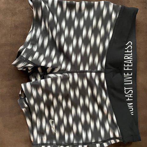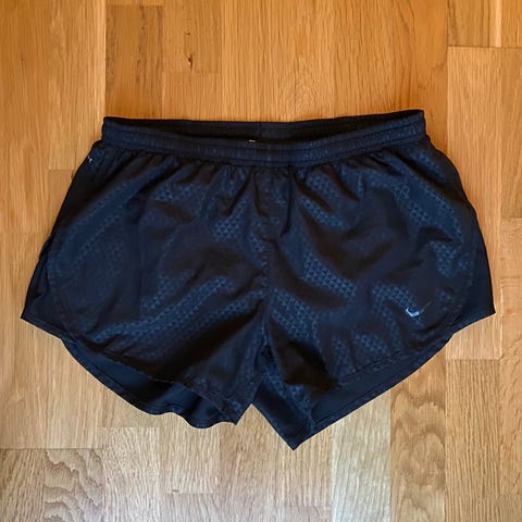 Nike Dri-FIT løpeshorts for dame i størrelse S. Laget av pustende materiale med Dri-FIT-teknologi for å holde deg tørr under løping. Shortsen er svart med signalgul innershorts. Superfin, selges med tungt hjerte fordi den er for liten for meg. Lite brukt.