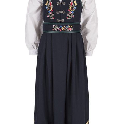 Bunad festdrakt og cape i blå farge, størrelse XXL. Festdrakten har broderte detaljer og tradisjonelle spenner. Capen er laget av et mykt materiale og har en dekorativ lås. Passer til tradisjonelle anledninger. Veske som festes på baksiden av beltet følger med. Samme mønster i den som i festdrakten. Pent brukt.