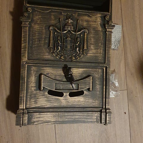 Postkasse. Overflaten er preget av rust og slitasje, med synlig metall under. Postkassen har hull øverst på baksiden som kan tyde på at den har vært vegghengt.