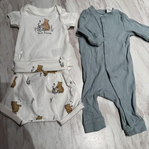 Klespakke med diverse tøy, blant annet en body av merket Hugo boss, cardigan fra tiny one osv. samlet pris for pakken er 60, kan kjøpes separat. Hugo boss bodyen er fra 3-6 mnd men er liten i størrelse. Ellers er klærne i størrelse 50