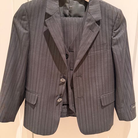 Jakke og vest som kan kombineres med ulike bukser og skjorter for å endre hvor pyntet de blir. Stoffet er grått i bunnen, men har et diskret rutemønster over. Ingen skader. Veldig pent brukt.