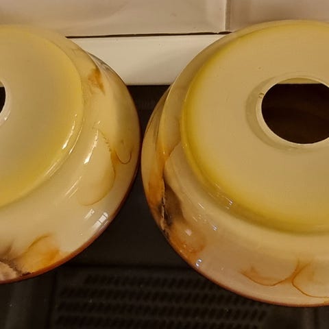 5 kupler til 5-arma lysekrone i et materiale som ser ut som marmor.. Diameter 15 cm, åpning på toppen 4 cm, høgde 7 cm, tykkelse 0,5 cm. Den eine kuppelen har vore limt, sjå bilete 13 og 14.