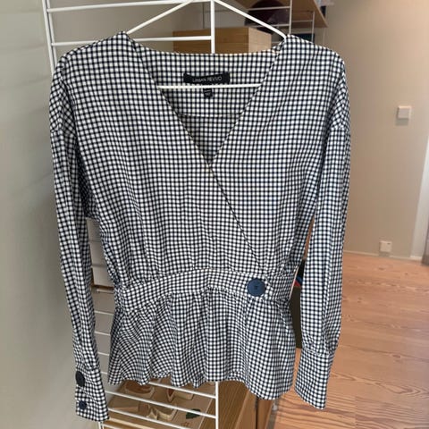 Som ny. Str. M. Enkel rett fasong. Tynt fint stoff. Knapper helt ned i front. Ermlengden er rett under albumen. Knapp nederst på ermene. Kan sendes som brev til kr. 58 eller bruk Fiks ferdig