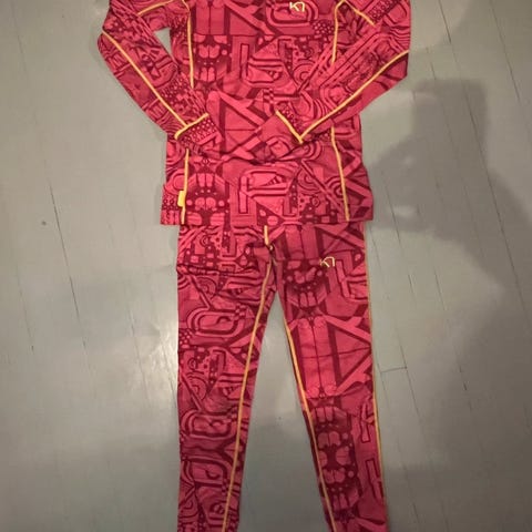 Shortsen har ei bukse under og ei i lettere stoff utenpå. Merke Gymshark. TreningsBH fra Kari Traa. Toppen er i merket Domyos. Lappen som viser materiale osv er fjernet, og den har en liten skjønnhetsfeil ved at en tråd er løs nederst på ryggen, se bildet. Kr. 50 pluss porto.