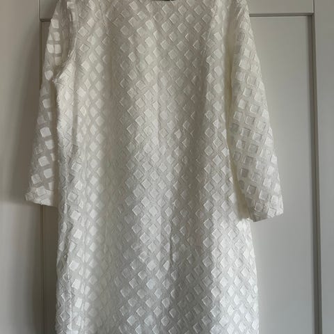 Selger en hvit cocktailkjole med klassisk og tidløs passform. Kjolen har glidelås som går hele veien ned langs baksiden, noe som gir et moderne og elegant uttrykk.