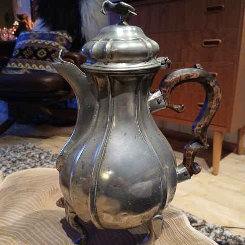 Samovar 26 cm høy og ca 14 cm på det bredeste. Ganske tung, så mulig det er kobber eller messing.