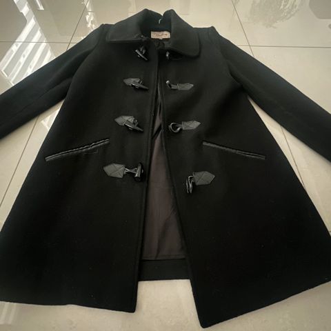 En god, lett og varm jakke med 40% ull, som går ned til knærne. Normal i størrelsen.