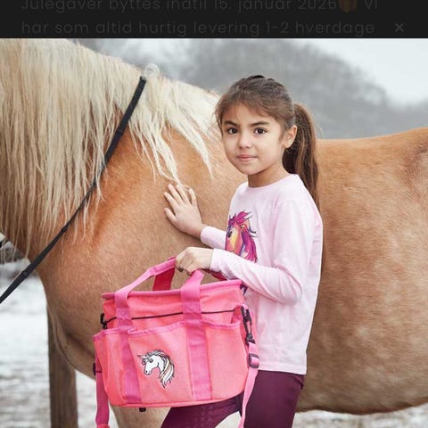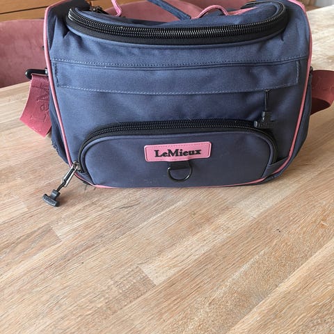 Det er krok bak på den slik at den kan henges opp på boksen. Og også en lang reim og en kort reim til å bære den. Superfin stelleveske til børster og utstyr.