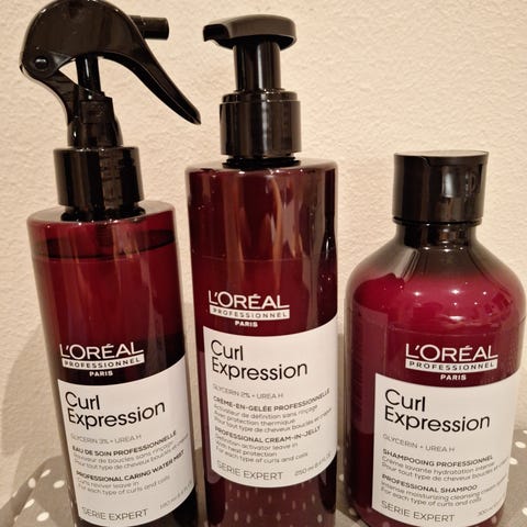 Brukt frisørsjampo og frisørbalsam fra Loreal expert serie. Pumpe på begge flasker.