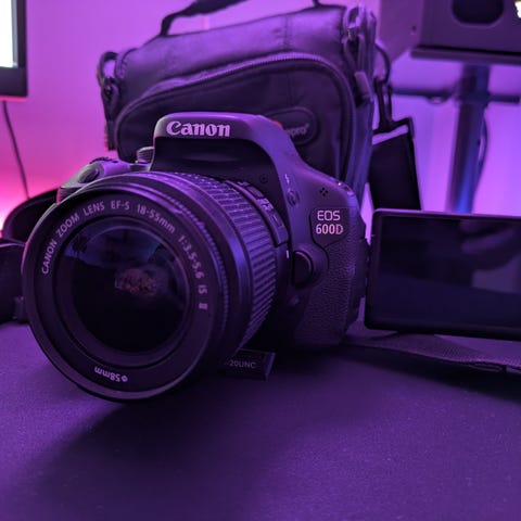 Canon EOS 600D digitalkamera med standardobjektiv. Kameraet er utstyrt med en 18-55mm zoomlinse, kamerarem, batterilader, ekstra objektivdeksel og en brukerveiledning. Kameraet er svart og egnet for fotografering i ulike situasjoner.
