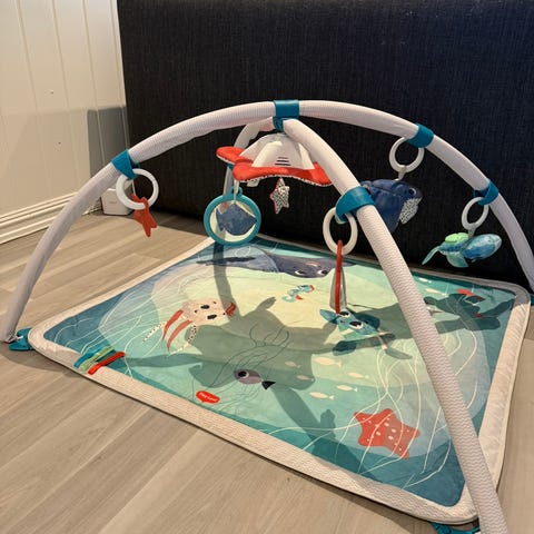 Fisher-Price lekematte/babygym for barn med fargerike mønstre og tilknyttede leker. Matte laget i mykt materiale med buer som henger flere leker for stimulering og lek. Egnet for små barn for å oppmuntre til motorisk utvikling og sansestimuli.
