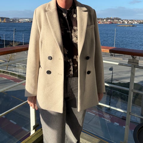 Deilig og fin kåpe, med kult snitt og fine farger. Brukt lite, da jeg synes den er litt lang til meg. (Jeg er 163 høy)