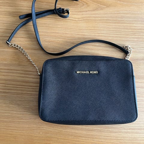 Michael Kors skulderveske laget av lær, designet for dame. Vesken har en svart farge og en justerbar skulderrem med kjededetaljer. Den har glidelås på toppen og et innvendig rom med fôr. Egnet til daglig bruk for å bære personlige eiendeler.