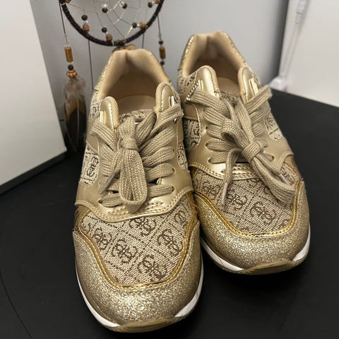 Guess sko i størrelse 36. Skoene har en brun/gull farge med mønster og er laget av tekstilmateriale.