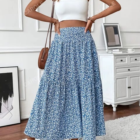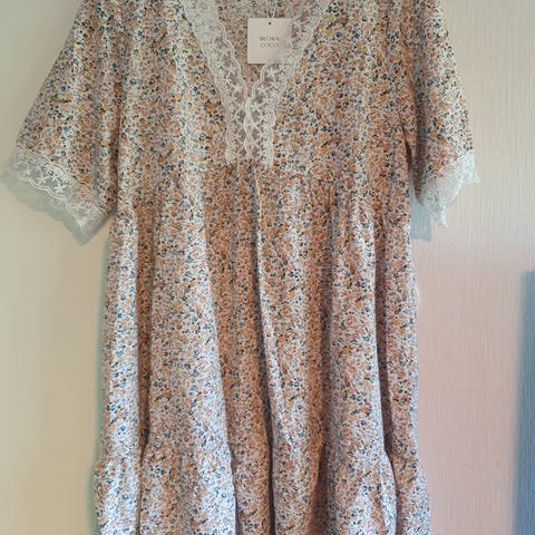 Turkis og hvit mønsteret mulig kjøpt på temu kr 50. Kjolen er til midt på leggen. Mer som L