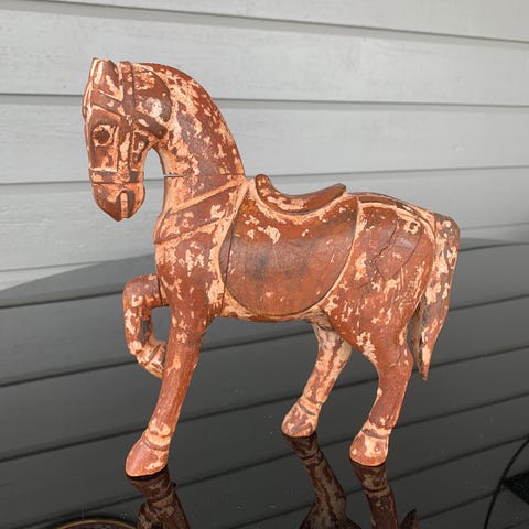 Nydelig utskåret hest av gyllenbrunt tre. Laget av ett stykke. H:27 cm. L:30 cm. Ingen skader.