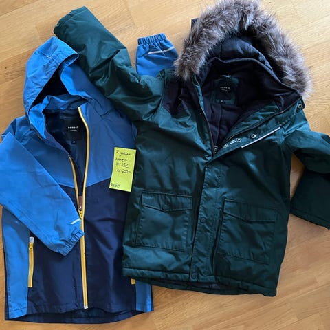 To fine ytterjakker i str 128. Den grønne jakken fra Cubus er helt ny, den blå jakken fra Name It er godt brukt.