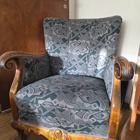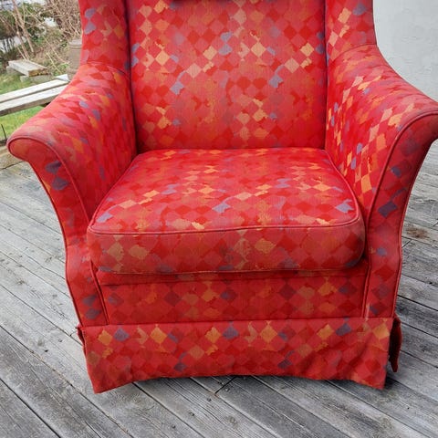 En stol har original kledsel (2 forskjellige farger, beige og rustrødt) og en stol er trukket om med rosa plysj. Stolene er pent brukt og lagret i mange år.