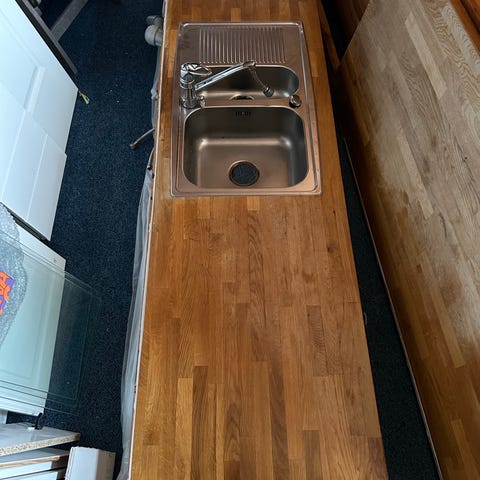 Kjøkkenbenk 3,5 cm tykk, 241,5 cm lang, 62 cm dyp med tilhørende oppvaskkum 75,5x 50 cm delt i to: bredeste del 40x 40 cm, smaleste 26x 40 cm. Blandebatteri montert med avløpsanlegg er på. Benken trenger en slip og olje hvis man skal ha denn fin. Det er tungt, du må ha med bærehjelp