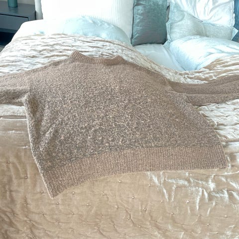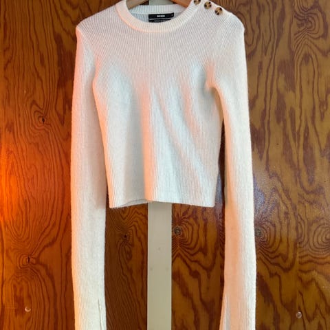 Bik Bok genser i størrelse S for kvinner. Genseren er lys grønn Tone og laget av en blanding som inkluderer alpakka, noe som gir et mykt og varmt materiale.
